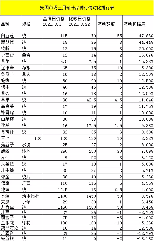 事實上,除了亳州藥材市場,安國藥市也有多種品種行情上揚。例如草果、郁金、黑胡椒、白豆蔻等。