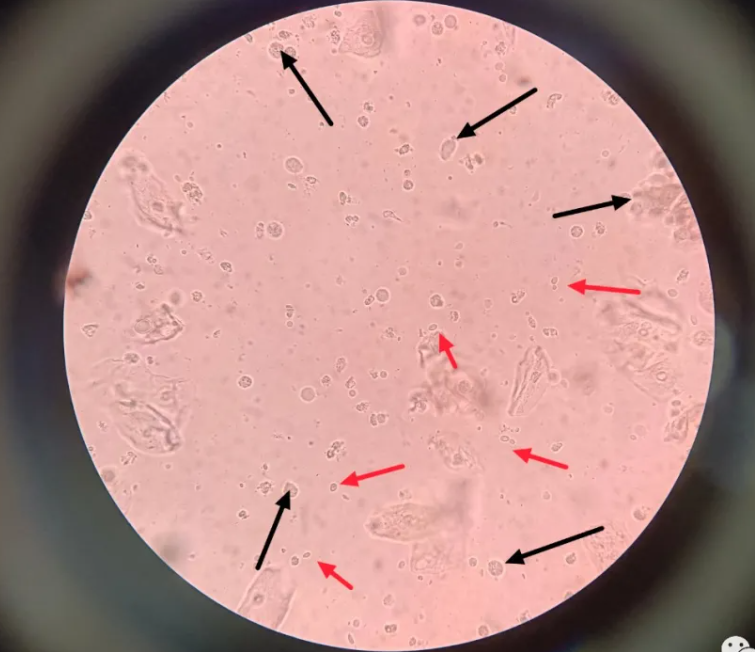 在顯微鏡下,最引人注意的是運(yùn)動(dòng)活潑的陰道毛滴蟲(簡(jiǎn)稱滴蟲),見下圖黑色箭頭,但是旁邊的白細(xì)胞并沒有按常規(guī)出牌(增多),反而在正常范圍內(nèi)(平均一個(gè)視野6~8個(gè)白細(xì)胞),只能給清潔度打上Ⅱ度。出于日常檢驗(yàn)工作的細(xì)心,再加上這種凝膠狀白帶不可能沒有真菌,于是檢驗(yàn)醫(yī)生多看了幾個(gè)視野,終于發(fā)現(xiàn)了零零散散的真菌(白色念珠菌),見下圖紅色箭頭。