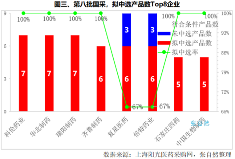 本土藥企科倫藥業(yè)、華北制藥和山東瑞陽制藥擬中選產(chǎn)品數(shù)量并列第一,都有7個產(chǎn)品中選。齊魯制藥、復星醫(yī)藥和倍特藥業(yè)并列第二,都有6個產(chǎn)品中選。石家莊四藥和中國生物制藥都中選了5個。其中,復星醫(yī)藥和倍特藥業(yè)各有3個產(chǎn)品落標,中選率67%,其余6家企業(yè)的產(chǎn)品悉數(shù)擬中選。