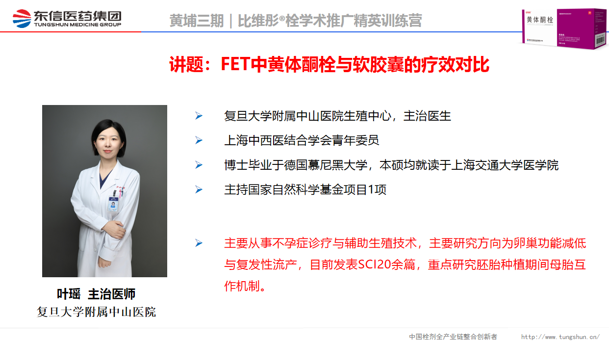 在專家授課環(huán)節(jié),復(fù)旦大學(xué)附屬中山醫(yī)院生殖科葉瑤醫(yī)師帶來了《FET中黃體酮栓與軟膠囊臨床對(duì)比》,葉老師介紹了黃體酮栓劑較肌注使用更為方便,不會(huì)有疼痛感,大大避免了痛苦的副作用和不良反應(yīng),同時(shí)不會(huì)產(chǎn)生口服黃體酮制劑生物利用度低、容易產(chǎn)生頭暈的弊端。隨后葉老師通過回顧性分析比較了黃體酮栓劑與軟膠囊在凍融胚胎移植的療效,黃體酮栓劑有著更高的妊娠率以及更低的早期流產(chǎn)率。