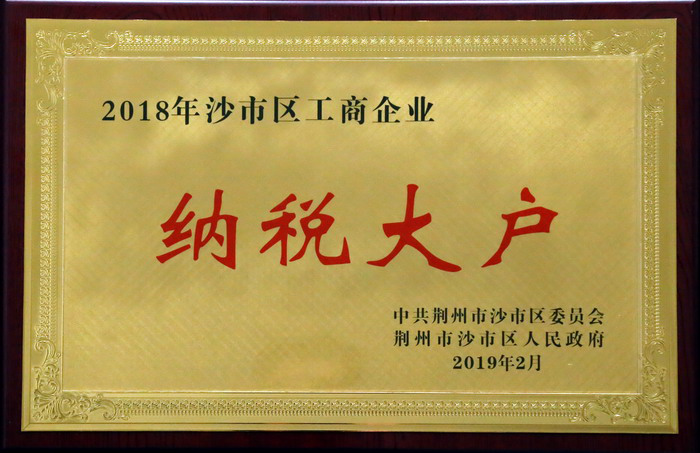 湖北東信藥業(yè)有限公司2018年度銷售額邁上一個新臺階,被中共荊州市沙市區(qū)委員會、沙市區(qū)人民政府評定為“2018年度沙市區(qū)工商企業(yè)納稅大戶”。