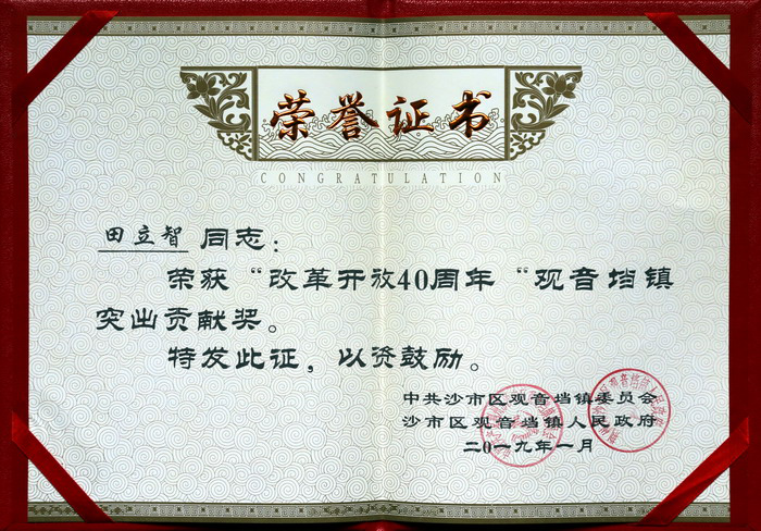 田立智榮獲觀音垱鎮(zhèn)“改革開放40周年”突出貢獻獎