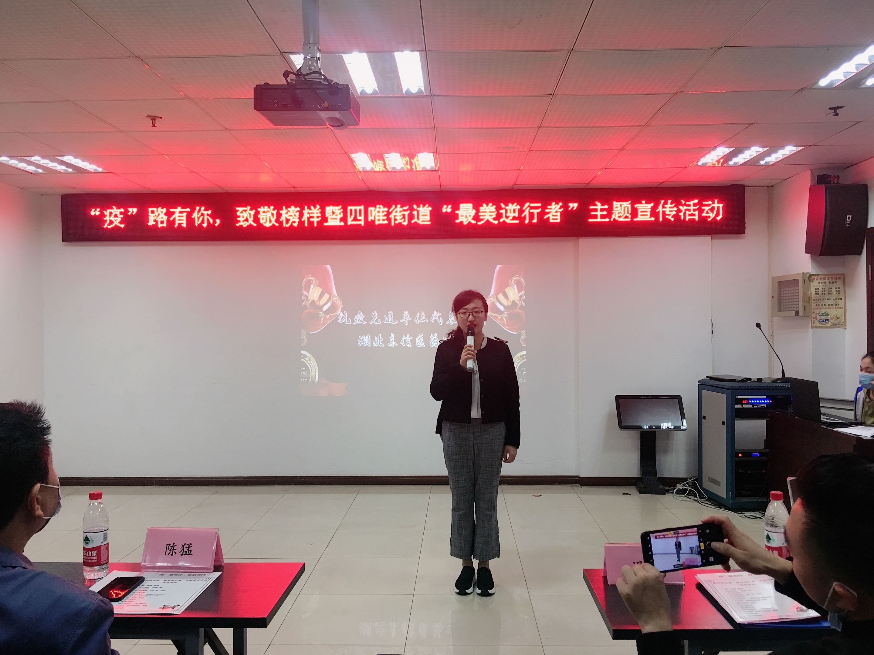 主題宣傳活動(dòng)期間,大家一起視頻學(xué)習(xí)了抗疫志愿者們不畏艱險(xiǎn)、逆行沖鋒的感人事跡,并邀請(qǐng)了抗疫先進(jìn)企業(yè)和志愿者代表上臺(tái)分享他們的抗疫故事。東信醫(yī)藥黨支部書記張琳作為企業(yè)代表,上臺(tái)講述了東信醫(yī)藥的抗疫事跡以及防汛精神,從疫情期間企業(yè)捐款捐藥,企業(yè)的黨員們帶頭走進(jìn)社區(qū)做志愿者,到防汛期間積極響應(yīng)號(hào)召,不辭勞苦,風(fēng)雨無阻,24小時(shí)堅(jiān)守在防汛巡查一線。東信醫(yī)藥的事跡讓大家深受感動(dòng),獲得了熱烈的掌聲。