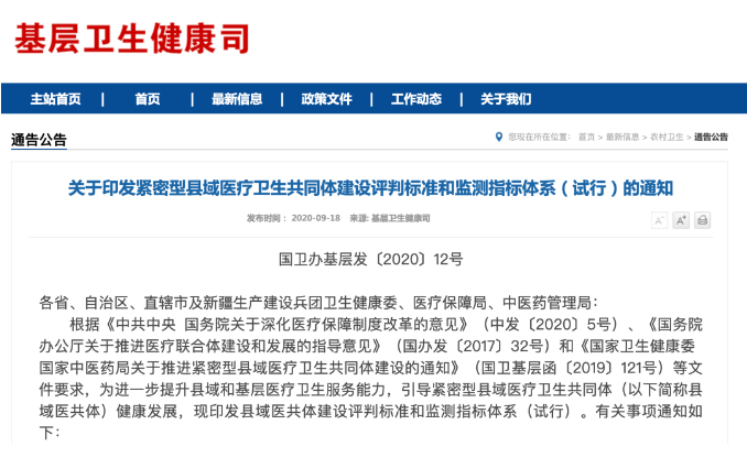 9月18日,國(guó)家衛(wèi)健委基層衛(wèi)生健康司發(fā)布《關(guān)于印發(fā)緊密型縣域醫(yī)療衛(wèi)生共同體建設(shè)評(píng)判標(biāo)準(zhǔn)和監(jiān)測(cè)指標(biāo)體系(試行)的通知》(以下稱《通知》),指出將進(jìn)一步提升縣域和基層醫(yī)療衛(wèi)生服務(wù)能力,引導(dǎo)緊密型縣域醫(yī)療衛(wèi)生共同體(以下簡(jiǎn)稱縣域醫(yī)共體)健康發(fā)展。
