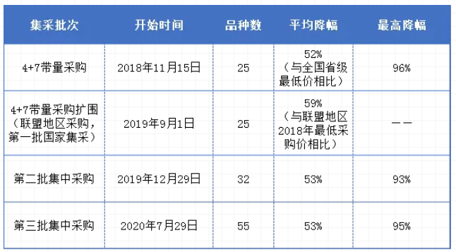 2020年7月29日,上海陽光醫(yī)藥采購網公布了全國藥品集中采購正式文件,第三批全國集采就此正式開始。8月20日,全國第三輪藥品集中采購申報信息公開大會在上海召開,同日深夜上海聯(lián)采辦發(fā)布第三批全國集采擬中選結果,55個品種中標,中選藥企達128家,品規(guī)平均降價53%,最高降價幅度超95%。