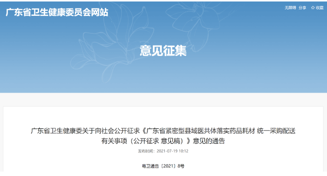 為提高縣域醫(yī)療衛(wèi)生資源配置和使用效率,7月19日,廣東省衛(wèi)健委官網(wǎng)發(fā)布《廣東省緊密型縣域醫(yī)共體落實(shí)藥品耗材統(tǒng)一采購配送有關(guān)事項(xiàng)(公開征求意見稿)》(以下簡稱《意見稿》),對其公開征求意見。這份僅有800余字的意見稿,字雖少但信息量大。