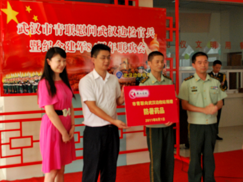 2011年8月1日,團(tuán)市委書記、武漢市青年聯(lián)合會(huì)主席沈濤及武漢市青年聯(lián)合會(huì)副秘書長、東信醫(yī)藥集團(tuán)董事長田南希代表武漢市青年聯(lián)合會(huì)向武漢邊檢官兵捐贈(zèng)防暑飲品。在紀(jì)念人民解放軍建軍84周年之際,表達(dá)了武漢市青年聯(lián)合會(huì)對邊檢官兵的崇敬之情,及東信醫(yī)藥集團(tuán)對邊檢官兵工作的關(guān)心與支持。