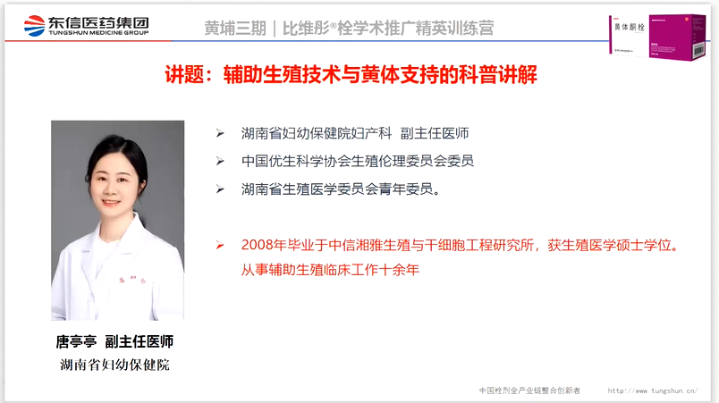 湖南省婦幼保健院生殖醫(yī)學(xué)中心的唐亭亭老師為大家?guī)砹恕遁o助生殖技術(shù)與黃體支持的科普講解》,唐老師先給大家介紹了什么是不孕癥和輔助生殖技術(shù),也介紹了輔助生殖技術(shù)中黃體支持的必要性。最后唐老師講解了黃體支持的常用藥物,其中黃體酮栓因采用水溶性基質(zhì)—硬脂酸聚烴氧酯,具有快速溶解、增加藥物分解、提高生物利用度和藥效的作用。并且還可直腸給藥,藥效并不會(huì)降低。