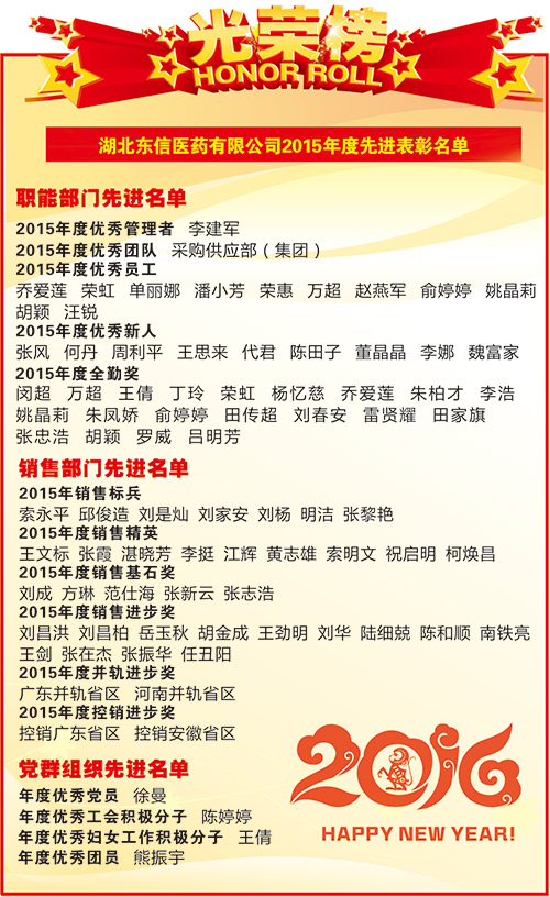 2月1日,是中國傳統(tǒng)的小年夜,在新年一片吉祥喜樂的氣氛中,“金猴獻瑞耀新春”——湖北東信醫(yī)藥有限公司2016年新春團拜會暨2015年度總結(jié)表彰大會拉開序幕。來自全國26個銷售省區(qū)的兄弟姐妹和公司各職能部門的全體同事、東信藥業(yè)、東信醫(yī)藥科技等兄弟公司的相關(guān)領(lǐng)導(dǎo)近300人歡聚一堂,共迎新年的到來。