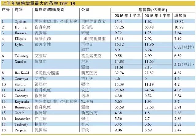 最近,各制藥公司的二季報(bào)陸續(xù)出爐,F(xiàn)irstWord網(wǎng)站通過比較各種藥物與去年上半年相比的銷售額增加值,列出了今年上半年銷售增量最大的18種藥物。