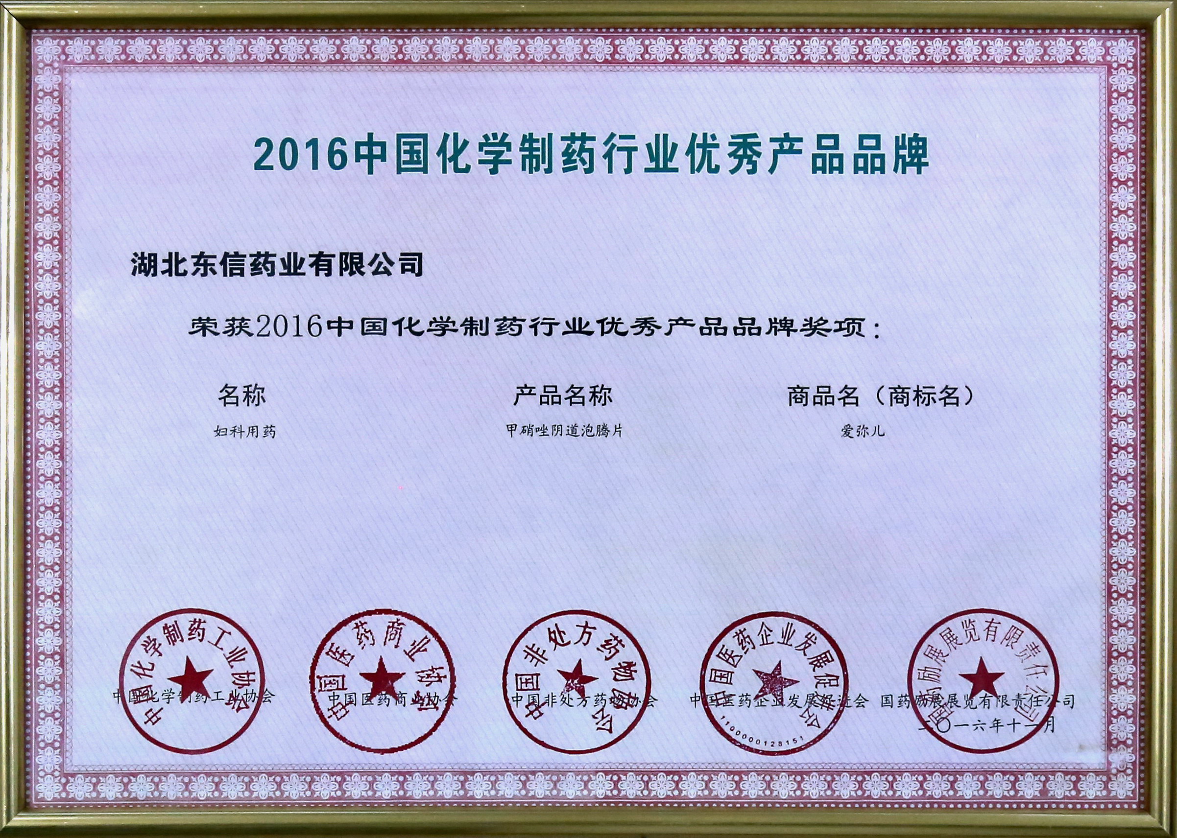 作為峰會(huì)的重要組成部分,期間發(fā)布了“2016’中國化學(xué)制藥行業(yè)優(yōu)秀企業(yè)”等4大板塊28個(gè)獎(jiǎng)項(xiàng)。湖北東信藥業(yè)有限公司榮獲“2016年中國化學(xué)制藥行業(yè)成長型優(yōu)秀企業(yè)品牌”,旗下婦科用藥——愛彌兒甲硝唑陰道泡騰片獲得“2016年中國化學(xué)制藥行業(yè)優(yōu)秀產(chǎn)品品牌”獎(jiǎng)。