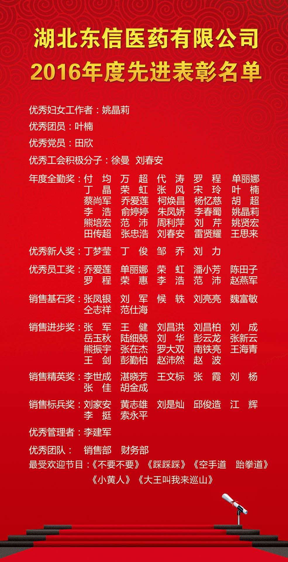 在精彩的節(jié)目進(jìn)行過程中,公司表彰大會(huì)也穿插進(jìn)行。公司董事長田南希女士、總經(jīng)理陳向先生、副總經(jīng)理營銷總監(jiān)李建軍先生、各職能部門領(lǐng)導(dǎo)以及來自東信藥業(yè)、東信醫(yī)藥科技、美洛酒業(yè)等相關(guān)領(lǐng)導(dǎo)相繼揭曉了“東信醫(yī)藥2016年度表彰大會(huì)”的各個(gè)獎(jiǎng)項(xiàng),并向獲得榮譽(yù)的先進(jìn)團(tuán)隊(duì)和個(gè)人頒發(fā)獎(jiǎng)品及榮譽(yù)證書。